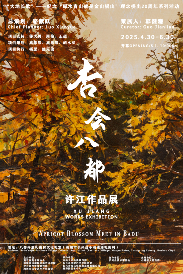 艺术家许江以油画为媒介,将描绘深秋八都岕银杏树的29幅画作带回其原生环境,构建艺术与自然、时间与空间的多维对话。此次展览旨在打破“画框”的物理边界,让绘画走出博物馆空间,回到视觉感知的起点,沉浸于十里银杏长廊的超时空语境中。在初夏时节一片新绿的银杏树中,透过艺术家的创作视角,让观众去想象深秋时节金灿灿的银杏树林景观;感受油画笔触下的生命力与八都岕千年银杏文化的深层联结,借助绘画艺术的能量为践行“绿水青山就是金山银山”的理念注入新的活力。