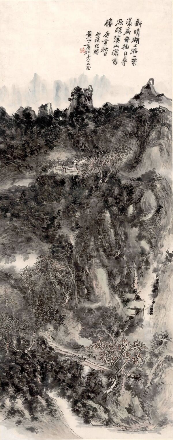《青城山中坐雨》 黄宾虹 纸本 设色 纵86.4厘米 横44.6厘米 年代不详 浙江省博物馆藏