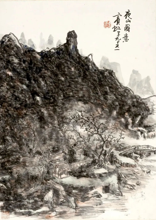 《夜山图意》 黄宾虹 纸本 设色 纵51.4厘米 横37.1厘米 1954年 浙江省博物馆藏