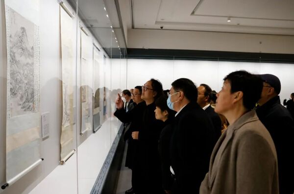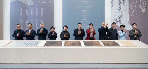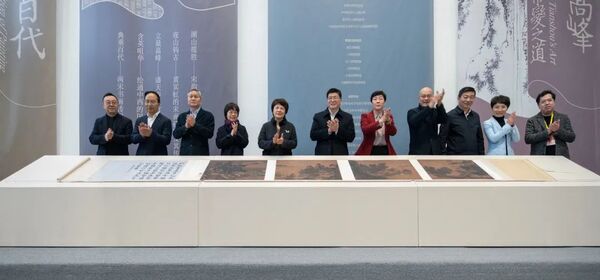 吴晶,成岳冲,刘冬妍,范庆瑜,毛宏芳,许江,黄海峰,金一斌,刁玉泉,夏丹荷,王跃工共同展开故宫博物院国宝级藏品《四景山水图》(复制件)的画卷,为展览启幕