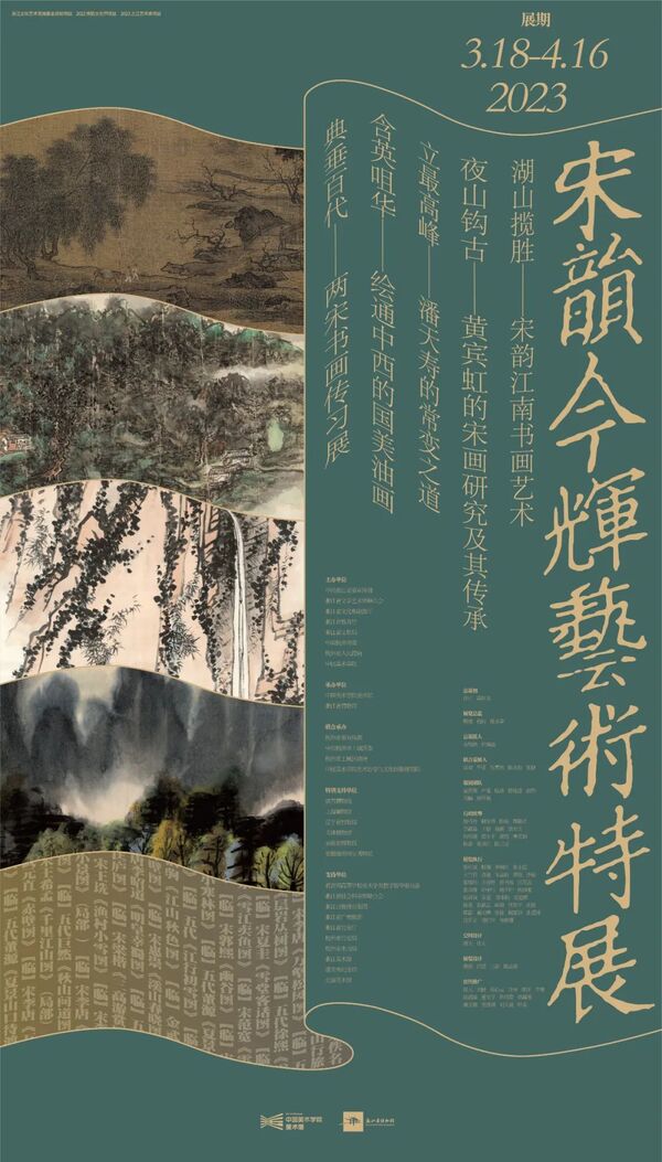 “夜山钩古——黄宾虹的宋画研究及其传承”、“立最高峰——潘天寿的常变之道”、“含英咀华——绘通中西的国美油画”、“典垂百代——两宋传习书画展”,共同构成“宋韵今辉”艺术特展集群。“夜山钩古——黄宾虹的宋画研究及其传承”展现了黄宾虹“师古人、师造化、得心源”的绘画之路;“立最高峰——潘天寿的常变之道”则呈现潘天寿“中西绘画,要拉开距离”,以“充分了解自己”的方式,以高度自信和宽广视野面对世界,呈现出来的新中国气象、新时代风神;“典垂百代——两宋书画传习展”,以中国美术学院师生的书画临摹作业,呈现不同时期学院教学中对宋代书画的传习;“含英咀华——绘通中西的国美油画”板块则以林风眠、赵无极等延至及当代具象表现绘画的油画作品,表现融汇中西的深厚脉络。