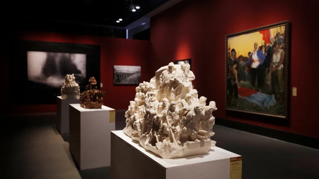 ▲ 序厅两侧,矗立着浙江文艺人历史群像和浙江百年创造文化集锦两块“丰碑”,中央陈列着《攻坚》雕塑小稿。