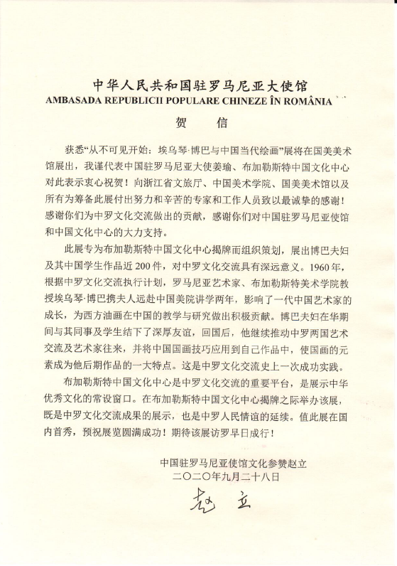 中国驻罗马尼亚大使馆文化参赞赵立代表中国驻罗马尼亚大使馆姜瑜大使和布加勒斯特中国文化中心致贺辞。姜瑜大使在贺信中指出,此次展览对中罗文化交流具有深远意义,博巴在华期间的教学和创作活动,是中罗文化交流史上的一次成功实践。这次展览既是中罗文化交流成果的展示,也是中罗人民情谊的延续。
