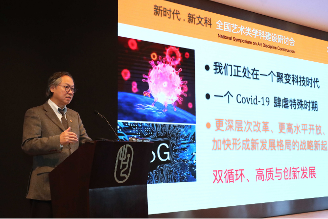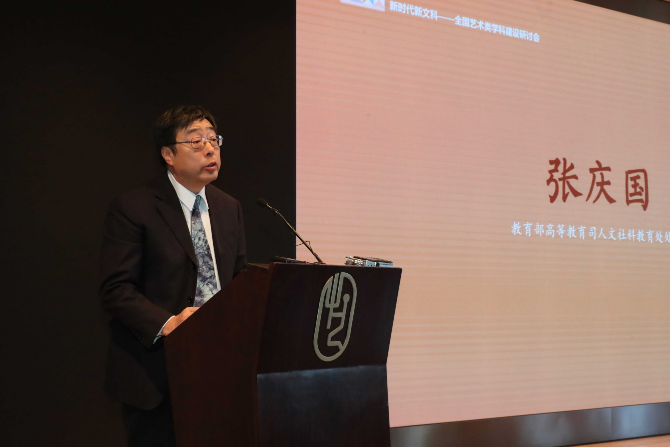 教育部高等教育司人文社科教育处处长张庆国在致辞中表示,在全国上下深入学习贯彻党的十九届五中全会精神之际,大家相聚在清华大学美术学院参加这次研讨会,是在新的历史时代背景下加快推进高等艺术教育创新发展,积极落实新文科建设工作会议精神的有力行动,更是学习贯彻党的十九届五中全会精神的生动实践。新文科建设要遵循守正创新、价值引领、分类推进这三个基本原则;把握专业优化、课程提质、模式创新这三个重大抓手;抓好中国政法实务大讲堂、中国新闻传播大讲堂、中国经济大讲堂、中国艺术大讲堂这四个关键突破;培养适应新时代要求的应用型、复合型文科人才。