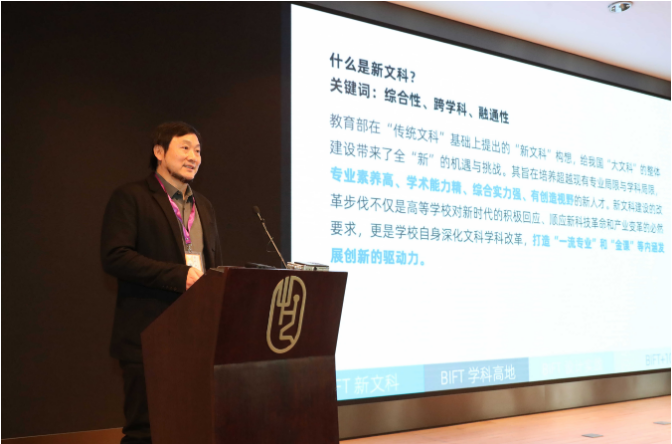 林家阳的发言题目为“设计的担当——新文科思想下的教学改革思考”,他认为在新文科语境下,当今的设计应该是“传统+现代”“传统+生态”“艺术+科学”“艺术+商学”,以及“知识+实践”。他提到乔布斯说过“设计学院终将取代商学院”,其本意是商学知识对设计师来说非常重要;他还提到在德国的高校博士毕业后是不能直接留校的,必须从事若干年的社会实践后才能做助教,之后申请更高级别的教职也需要先有社会实践经历。通过这些案例,他认为设计学科在新文科思想下肩负着发展重任,既要有远大的理想、崇高的志向,也要有脚踏实地的精神。