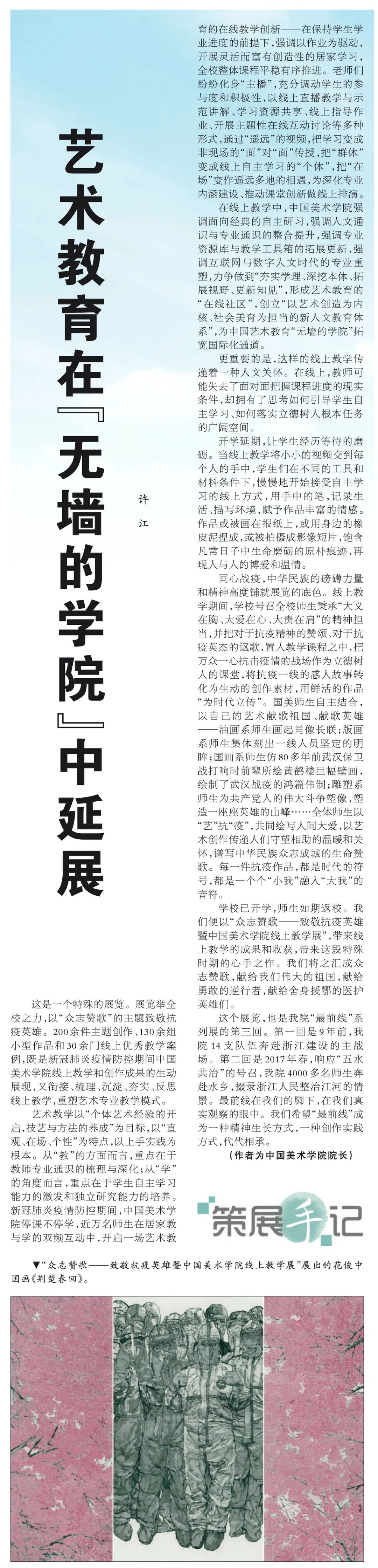 中国美术学院院长、艺术哲学与文化创新研究院负责人许江以《艺术教育在“无墙的学院”中延展》一文,讲述了我校以疫情期间线上教学的成果汇聚成“众志赞歌”教学展的策展手记,并于《人民日报》刊发,现予转载。