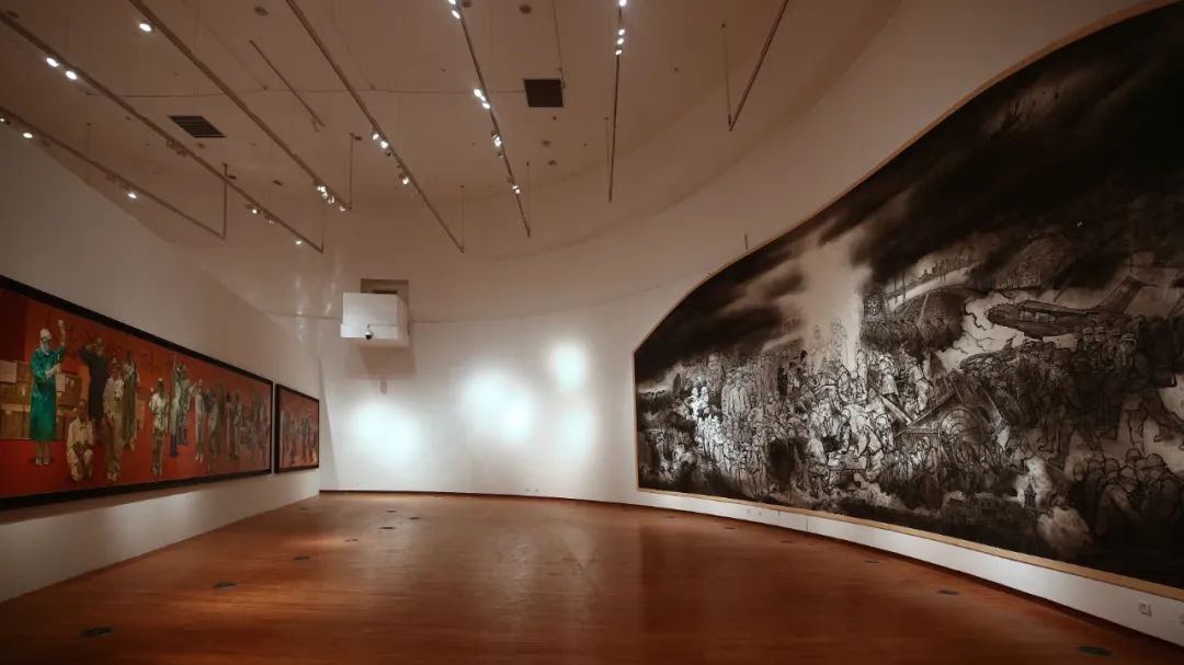 同心战疫,中华民族的磅礴力量和精神高度铺就展览的底色。线上教学期间,学校号召全校师生秉承“大义在胸、大爱在心、大责在肩”的精神担当,并把对于抗疫精神的赞颂、对于抗疫英杰的讴歌,置入教学课程之中,把万众一心抗击疫情的战场作为立德树人的课堂,将抗疫一线的感人故事转化为生动的创作素材,用鲜活的作品“为时代立传”。国美师生自主结合,以自己的艺术献歌祖国、献歌英雄——油画系师生画起肖像长联;版画系师生集体刻出一线人员坚定的明眸;国画系师生仿80多年前武汉保卫战打响时前辈所绘黄鹤楼巨幅壁画,绘制了武汉战疫的鸿篇伟制;雕塑系师生为共产党人的伟大斗争塑像,塑造一座座英雄的山峰……全体师生以“艺”抗“疫”,共同绘写人间大爱,以艺术创作传递人们守望相助的温暖和关怀,谱写中华民族众志成城的生命赞歌。每一件抗疫作品,都是时代的符号,都是一个个“小我”融入“大我”的音符。