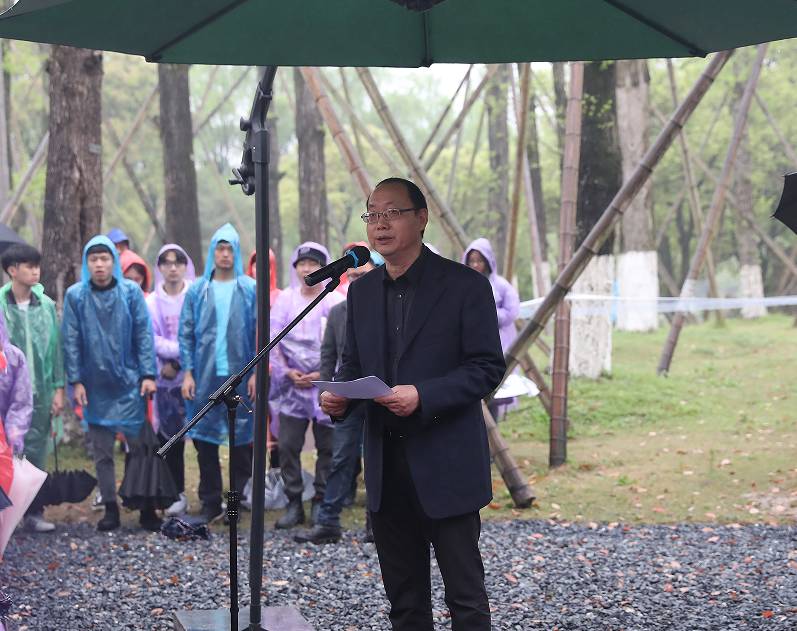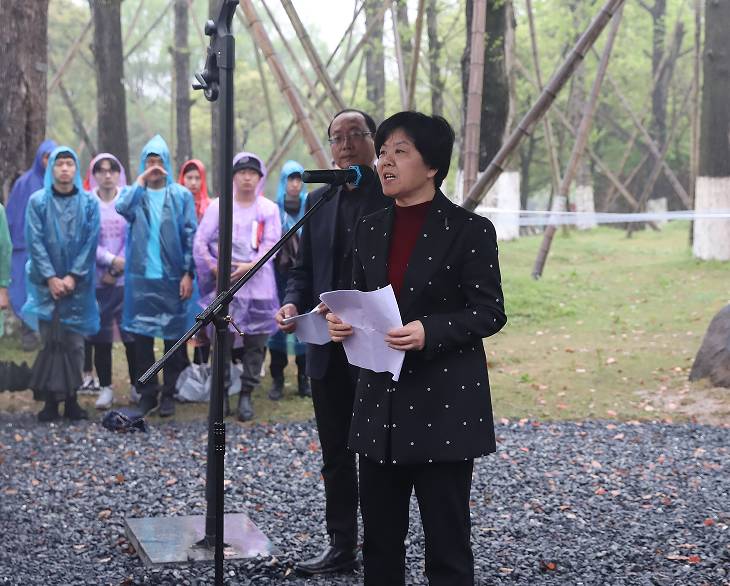 典礼在庄严的国歌声中拉开帷幕。党委书记钱晓芳首先致辞,她深情回顾了建校89年来,以蔡元培、林风眠、潘天寿、黄宾虹、刘开渠等为代表的先贤革除旧艺流弊,创造时代艺术、振奋民族精神的筚路蓝缕、开启艺程之昔;她诚挚感谢了前国家领导人李岚清先生先后两次为学院篆刻印章的深情厚谊,感谢诸位为“巨匠广场”的设计、建设付出辛勤劳动的国美师者,并号召今日的国美人回望来路、缅怀先师,要学习先师们坚守信仰、为艺术战的崇高精神,要弘扬先师们勇于创造、永攀高峰的开拓精神,要承继先师们美育济心、振兴民族的担当精神。如此,才能不负于先师的嘱托、国家的期望,为新时代中国艺术振兴、为中华民族伟大复兴而不懈奋斗、贡献力量。