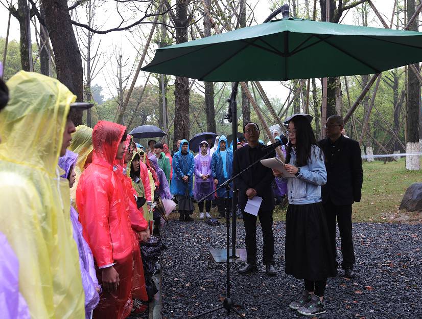 随后,学生代表周靖怡等朗诵许江院长诗作《向湖深之处敬礼》,以此向先辈先师致敬。典礼在师生合唱校歌声中落下帷幕,最后全体师生在巨匠广场前留下了珍贵合影。